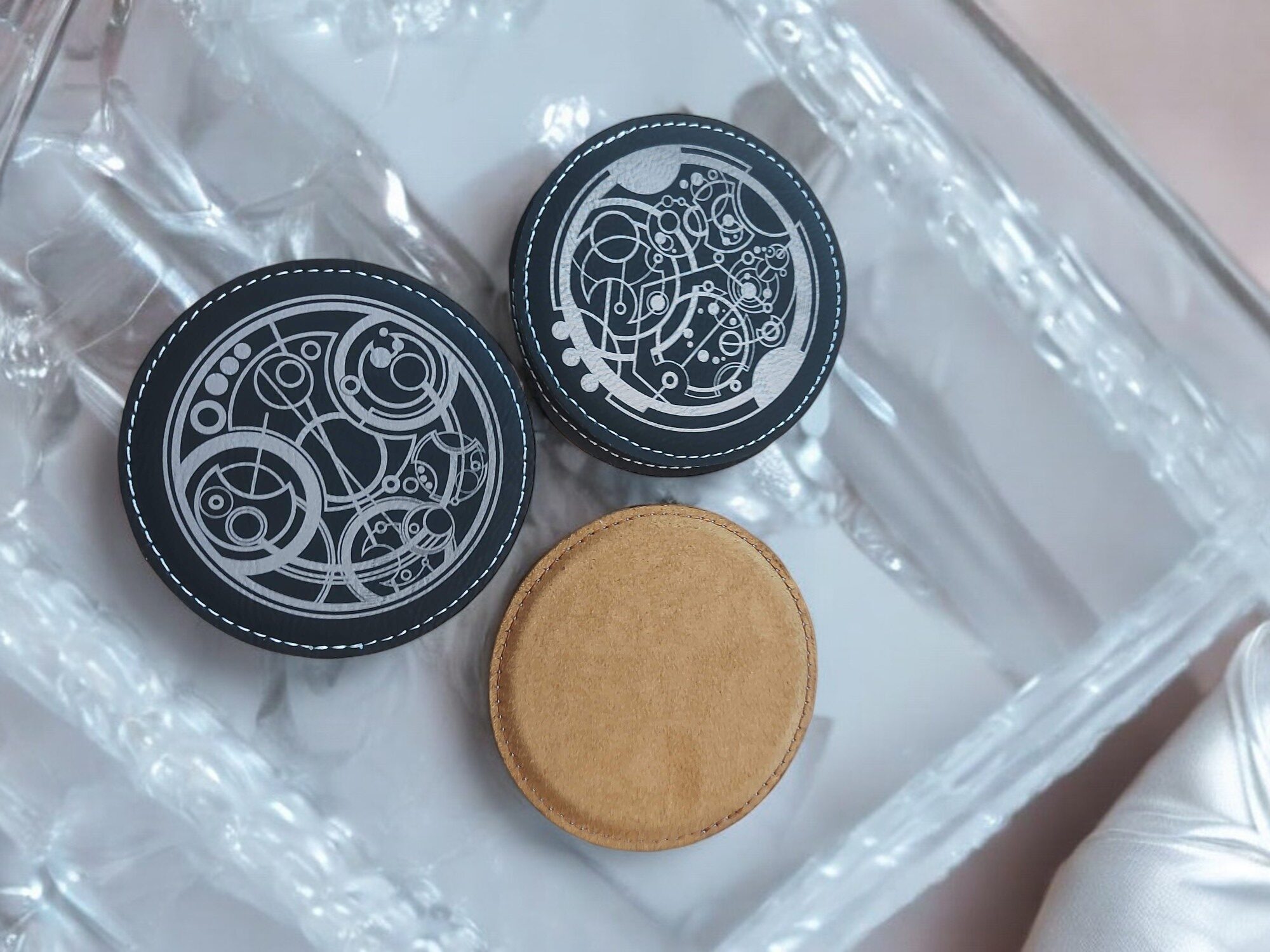 Bring a touch of the Whoniverse to your table with this Doctor Who Gallifreyan Coaster Set. Made from premium vegan leather and intricately laser engraved with Gallifreyan script designs, these coasters are a stylish way to show your fandom while protecting your furniture.