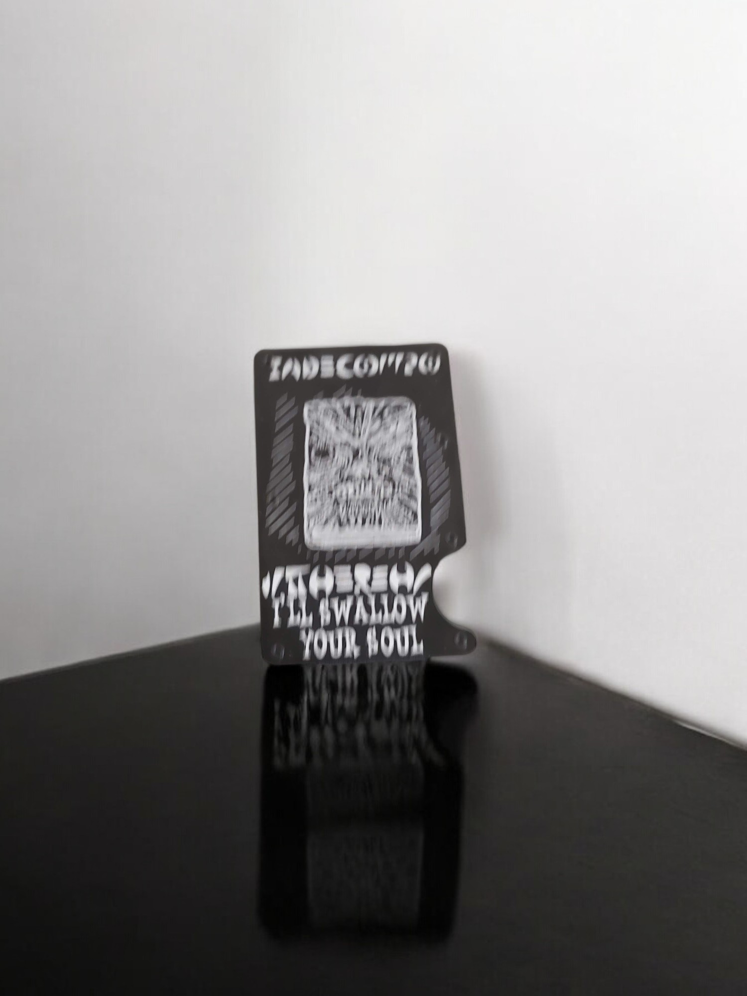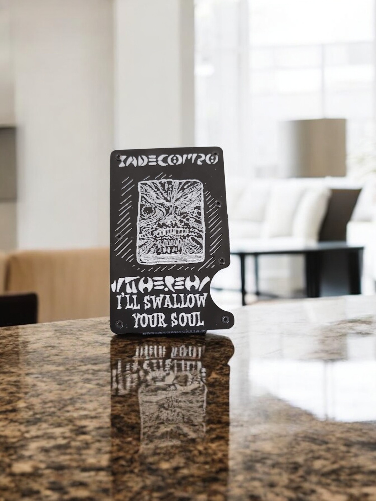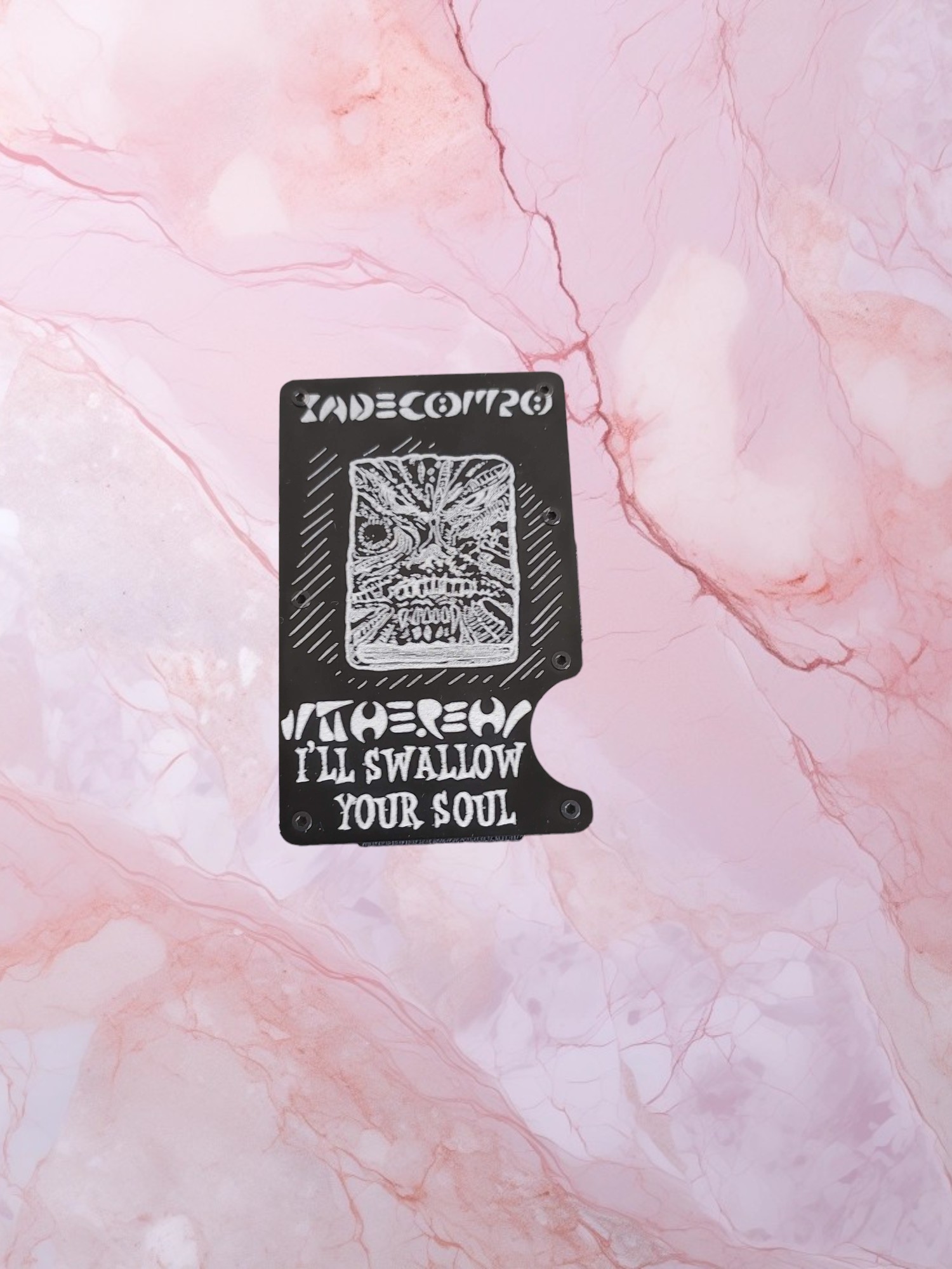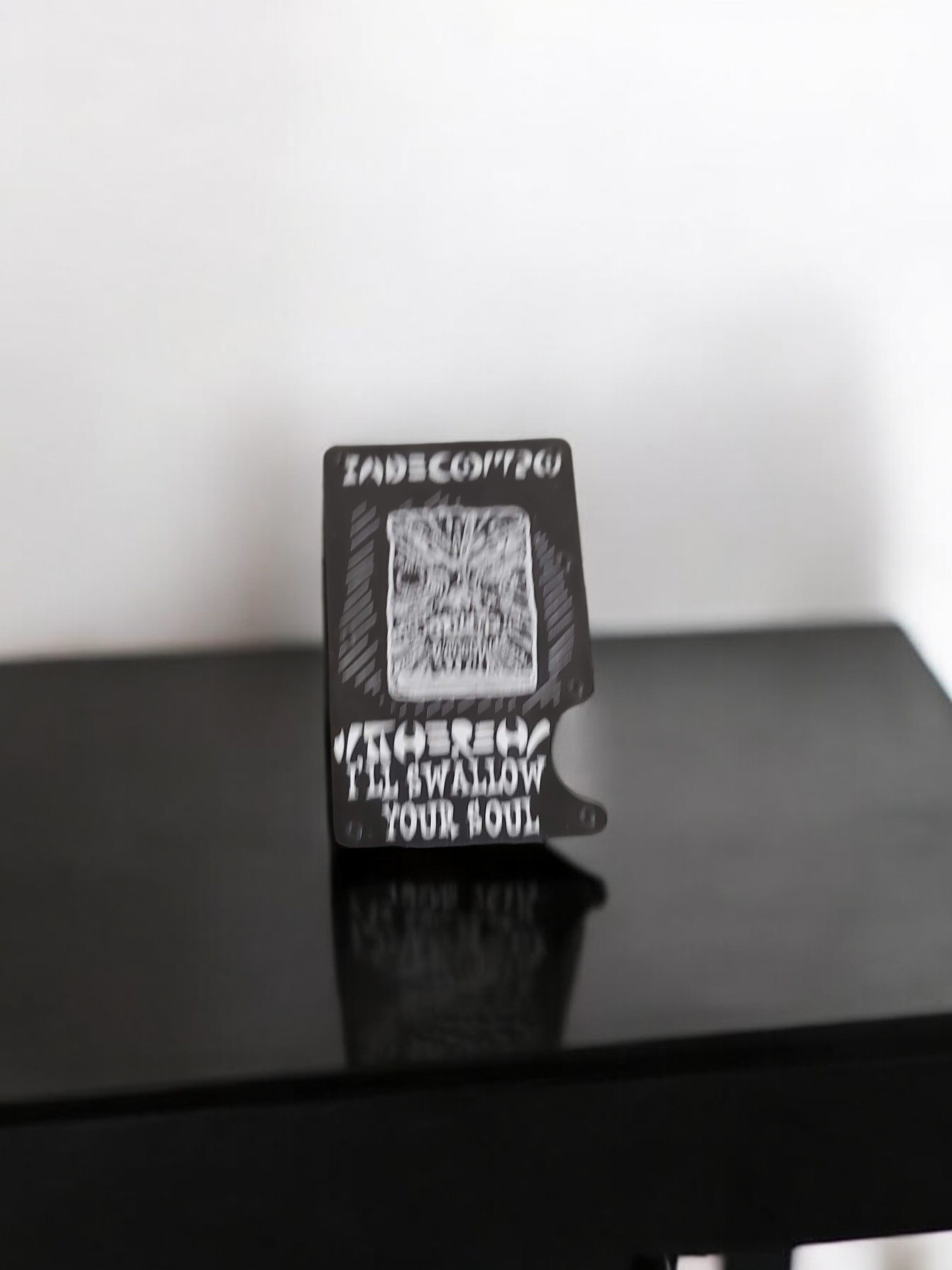 Evil Dead minimalist wallet with laser-engraved Necronomicon design. RFID-blocking metal wallet for horror fans & cult classic collectors.
