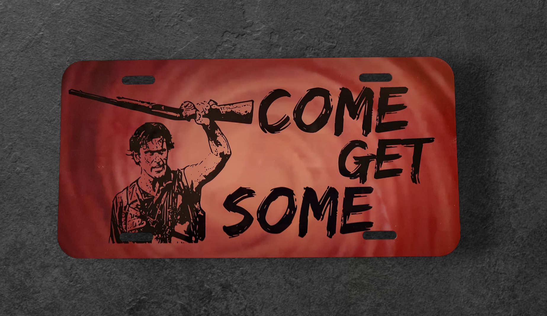 Unleash your fandom with this Evil Dead Vanity License Plate featuring Ash and his boomstick. Reads “Come Get Some” — the perfect horror fan collectible.